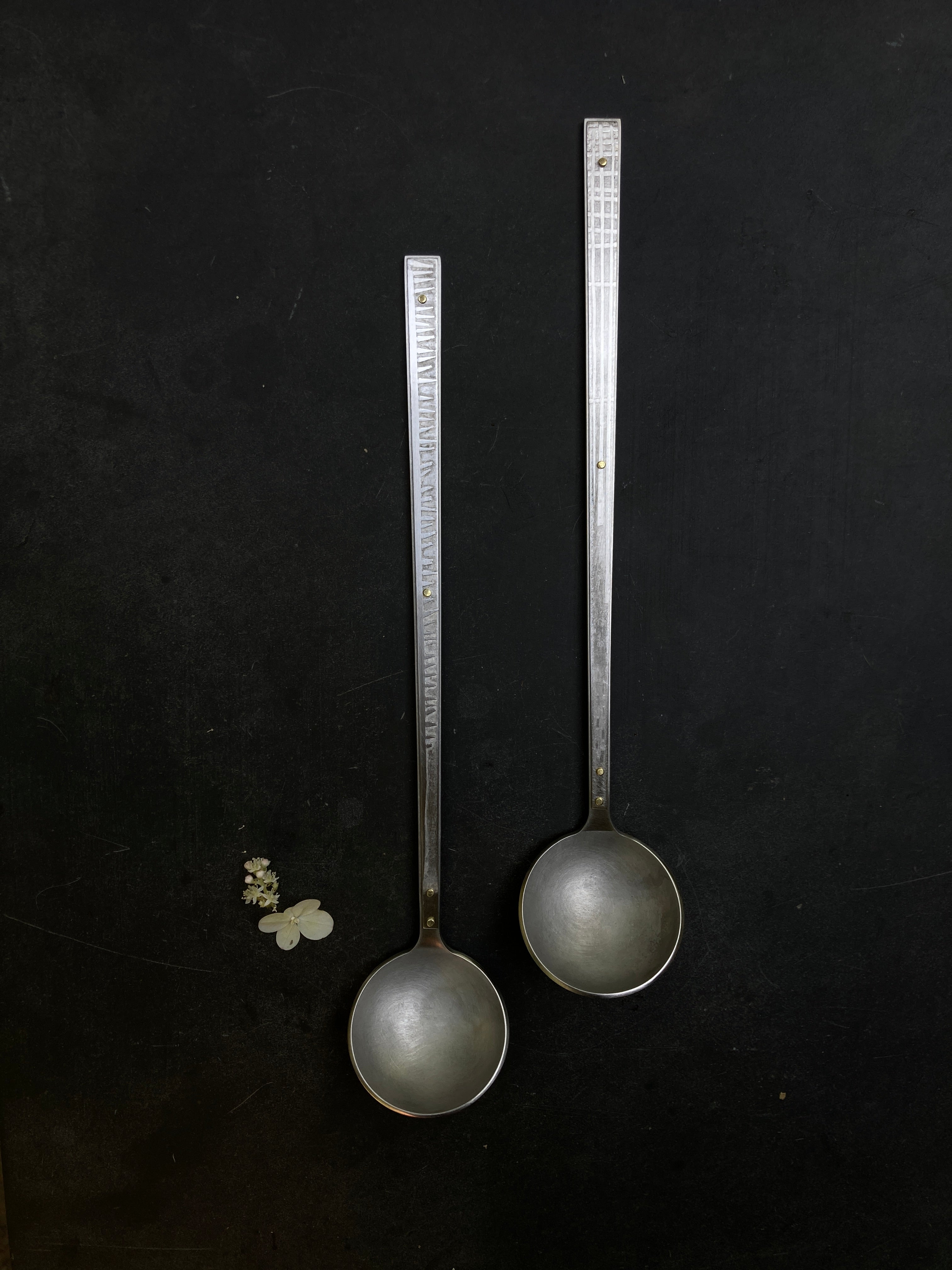 Stainless steel body with stainless steel layer on handle that is electroetched, where I hand cut vinyl shapes as a resist and then I etch with sea water and an electrical current to provide a unique one-off relief design. Brass rivets. Use for tasting, serving, or whatever you fancy. Select which one from the drop down menu.